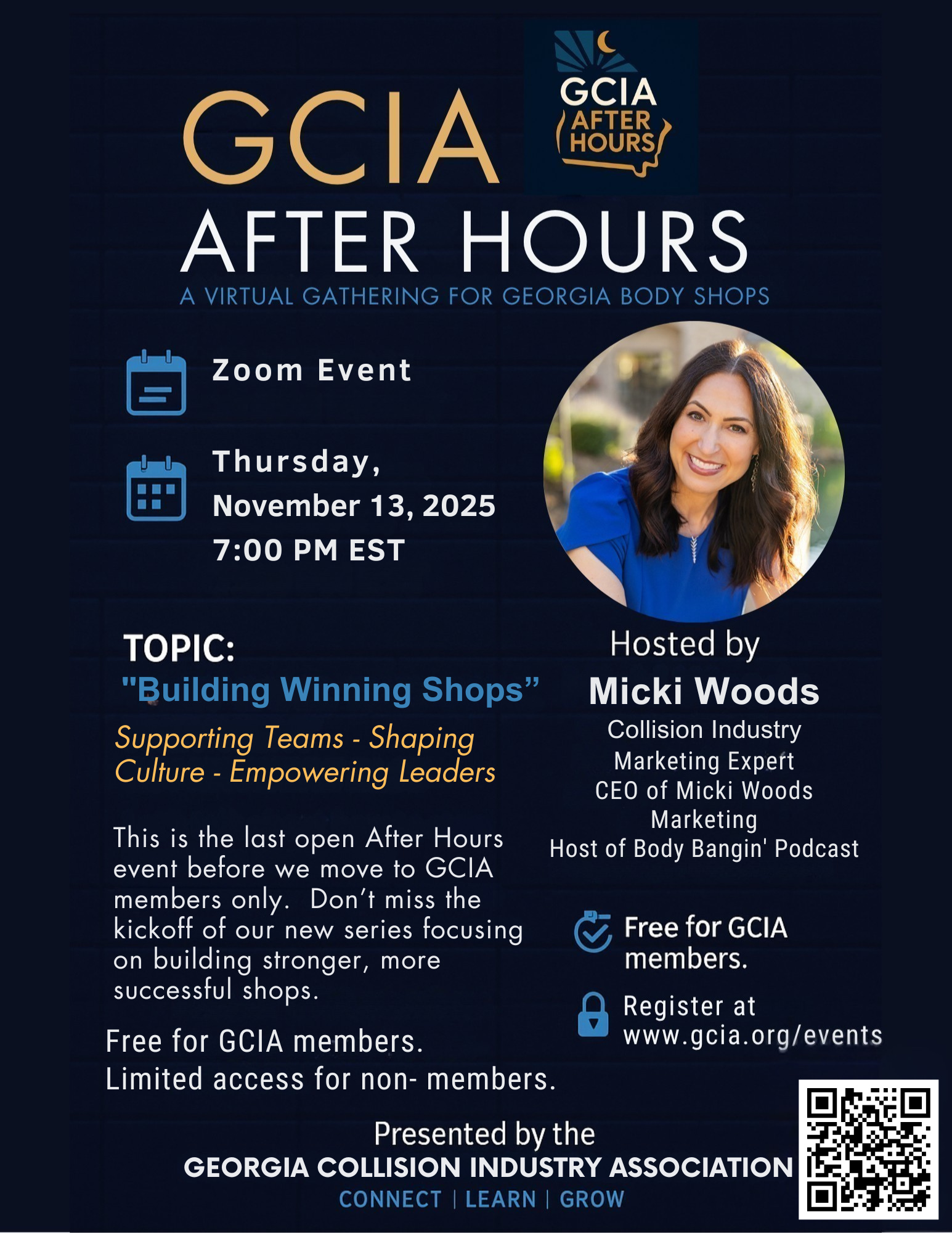 Hosted by industry powerhouse Micki Woods, this is your chance to connect, learn, and grow with fellow Georgia shop leaders—AFTER HOURS.